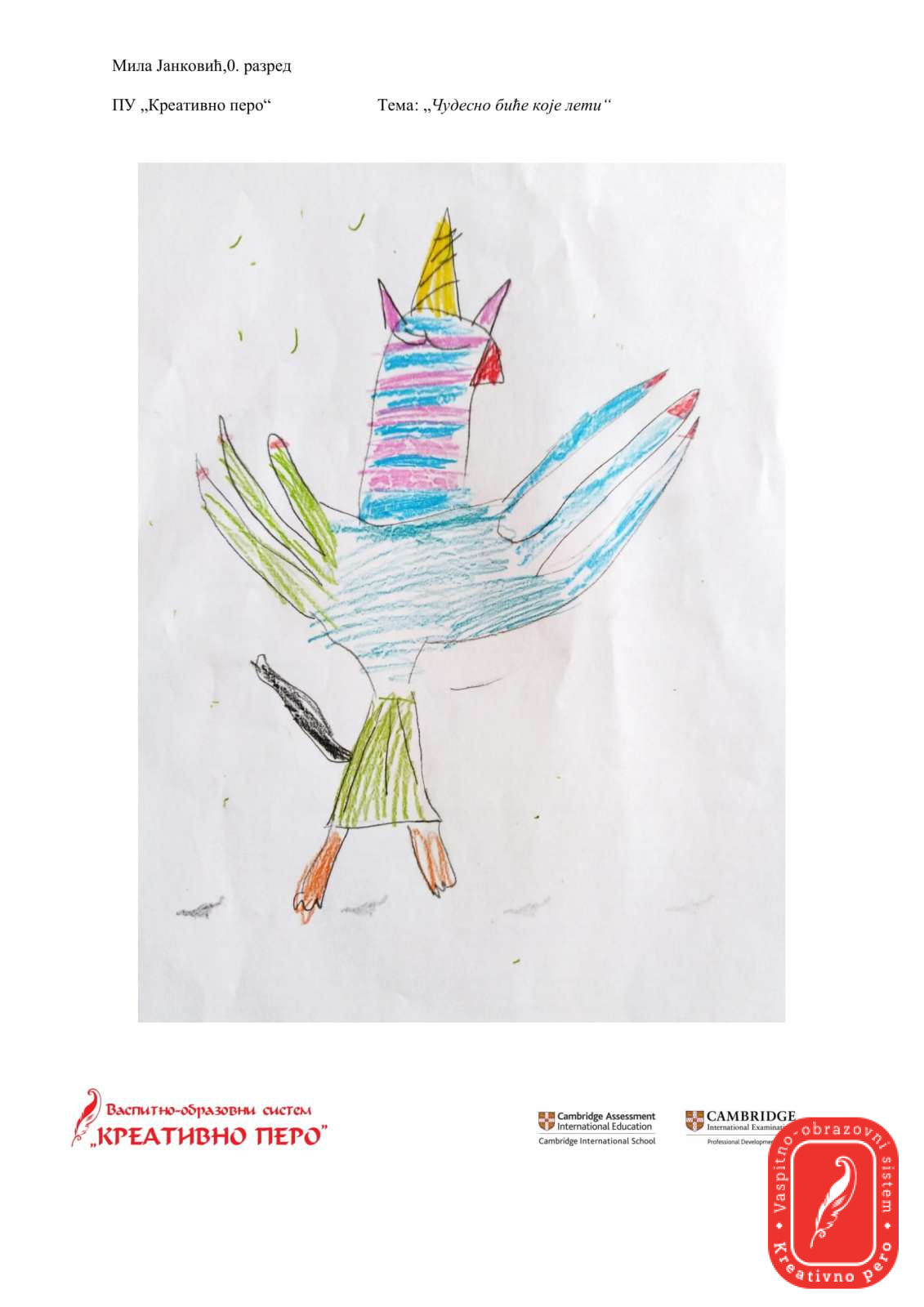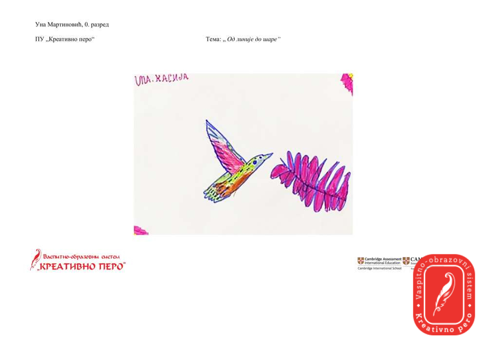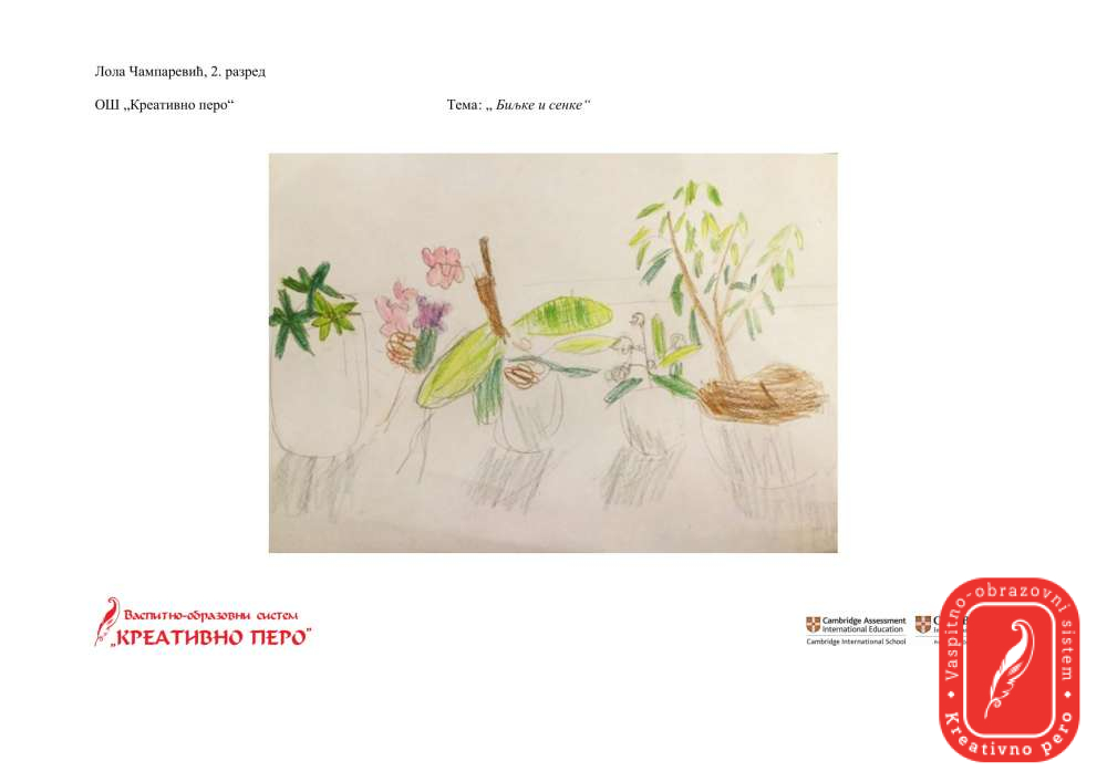 Лола Чампаревић је нацртала призор из свог стана, посматрајући биљке на прозору и сенке које оне праве, док је Мила Јанковић интересантним приказом на тему “Чудесно биће које лети” одговорила на задатак ликовне секције.