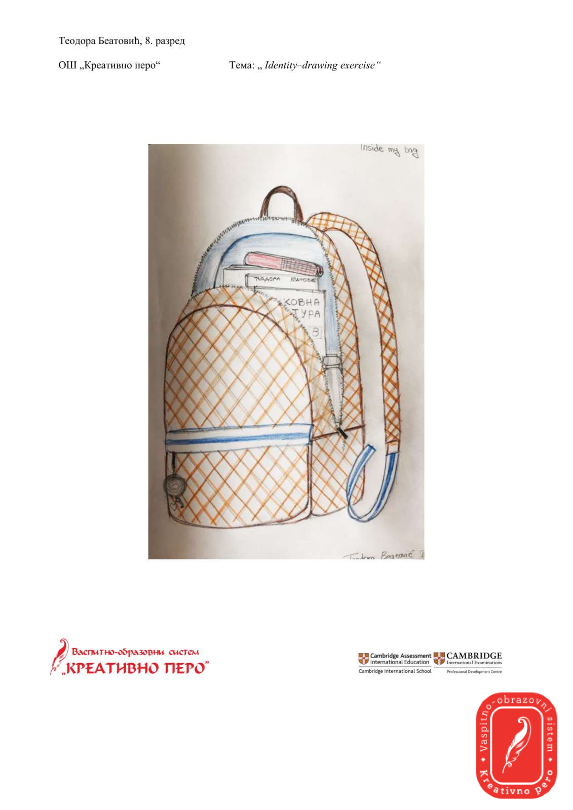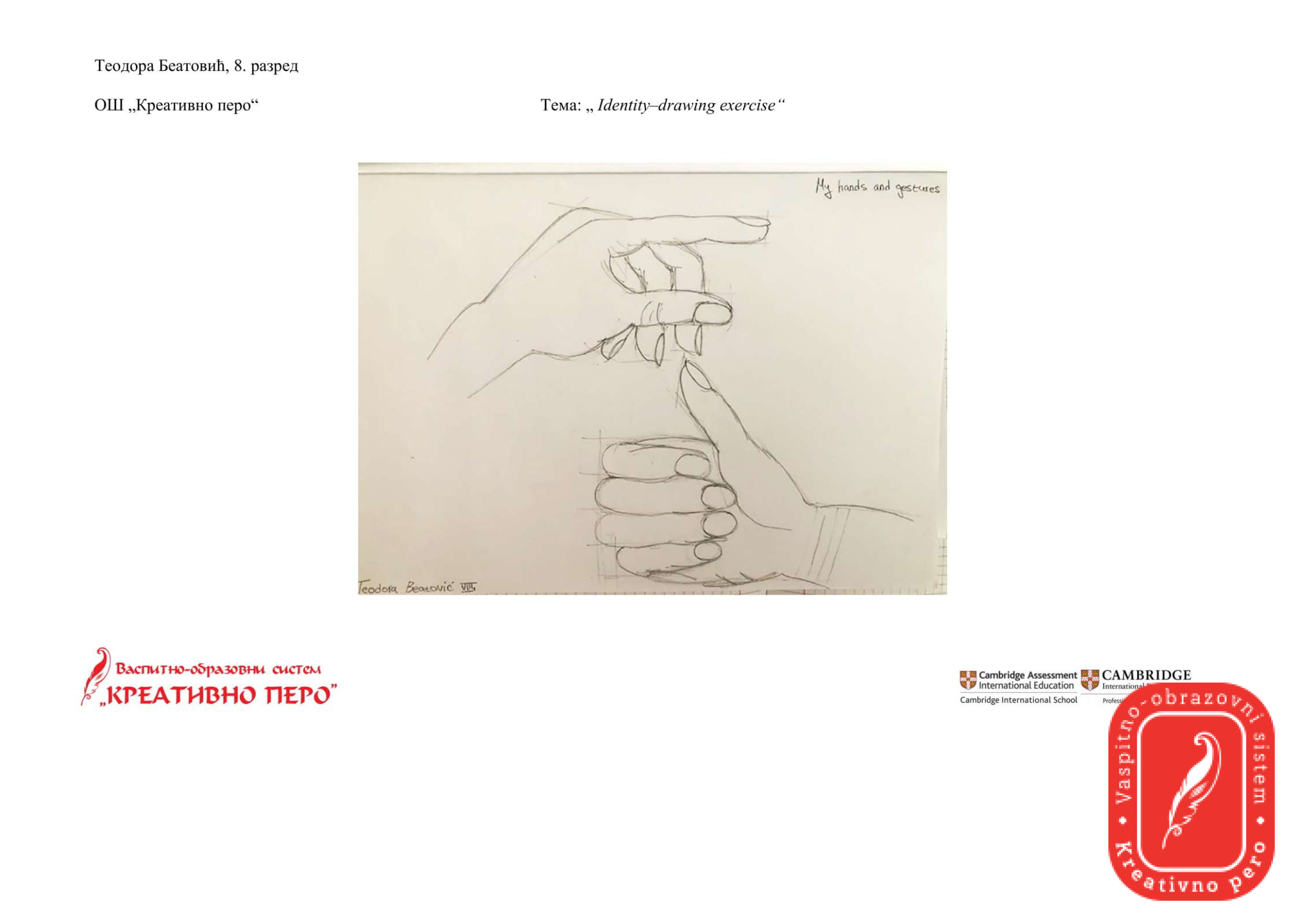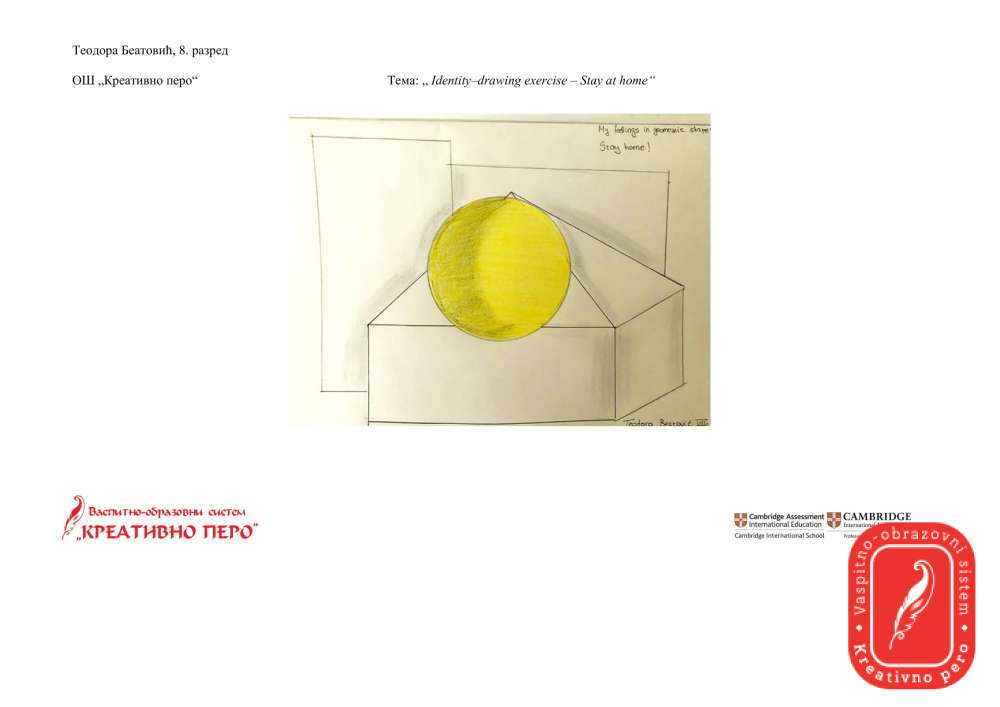 Теодора Беатовић је на тему “Identity-drawing exercise”,  направила три занимљива цртежа, од којих цртеж назван од стране ауторке “Stay at home”  представља Сунце у средишту куће и изражава осећања да ћемо ову ситуацију превазићи и поново имати светлу будућност.