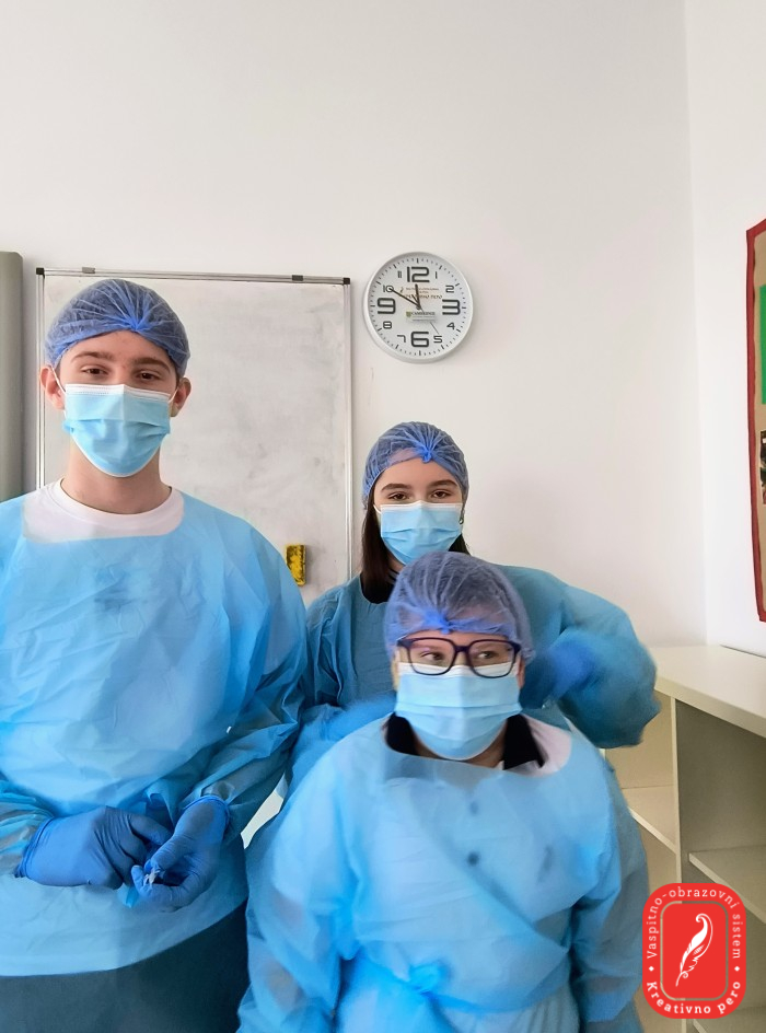 Госпођа Стевић је ученицима на занимљив и приступачан начин приближила како изгледа један радни дан анестезиолога, као и сам ток операције. Посебан допринос радионици дала је богатом колекцијом материјала које свакодневно користи у раду: заштитним оделом, маскама, рукавицама, шприцевима, инфузијама и другим медицинским помагалима.